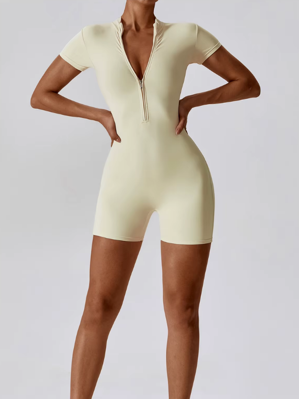 Combinaison courte à manches courtes avec zip frontal, conçue pour un maintien sculptant et un confort optimal, parfaite pour le sport comme pour un look athleisure affirmé.