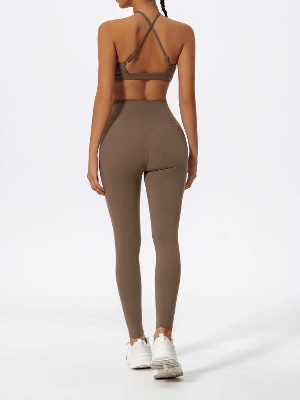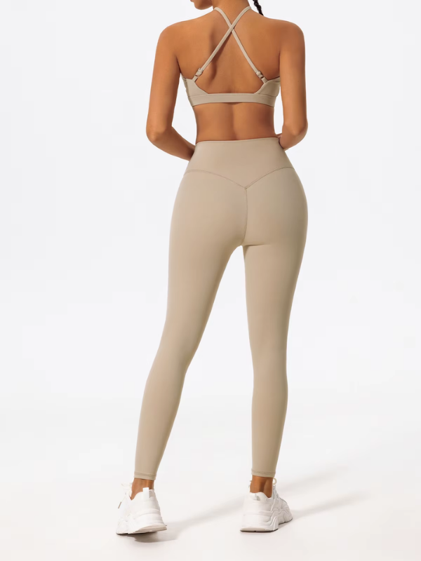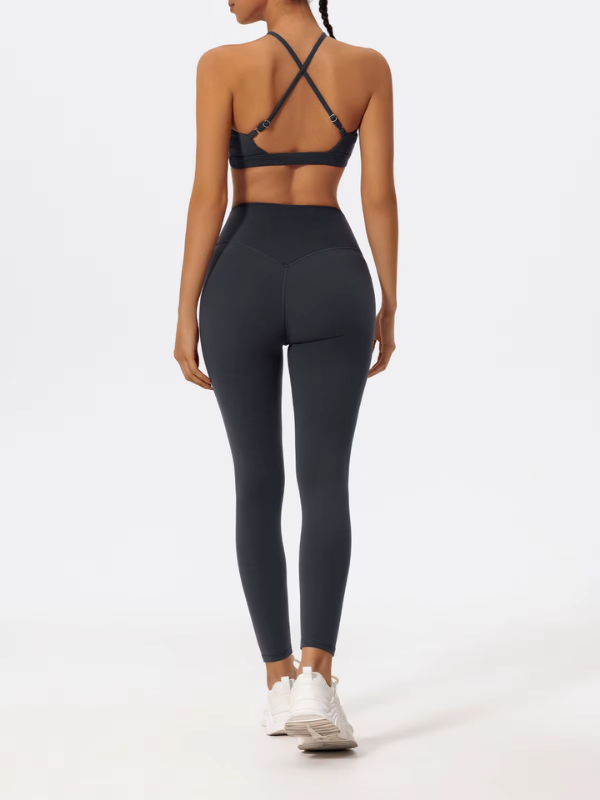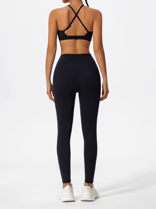 Brassière à bretelles croisées réglables et legging taille haute gainant, pensés pour conjuguer maintien, confort et liberté de mouvement lors de chaque entraînement.